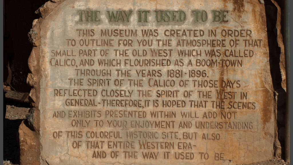 Walter Knott who had worked at the mines in 1910 is responsible for the town we see today. The original buildings, as in many of the early mining camps, were constructed from adobe brick for the lack of lumber. Cement has been used during the restoration but made to look as authentic as possible. Knott purchased Calico in the 1950’s restoring all but the five original buildings to look as they did before. Calico ghost town received State Historical Landmark status on November 20, 1962.