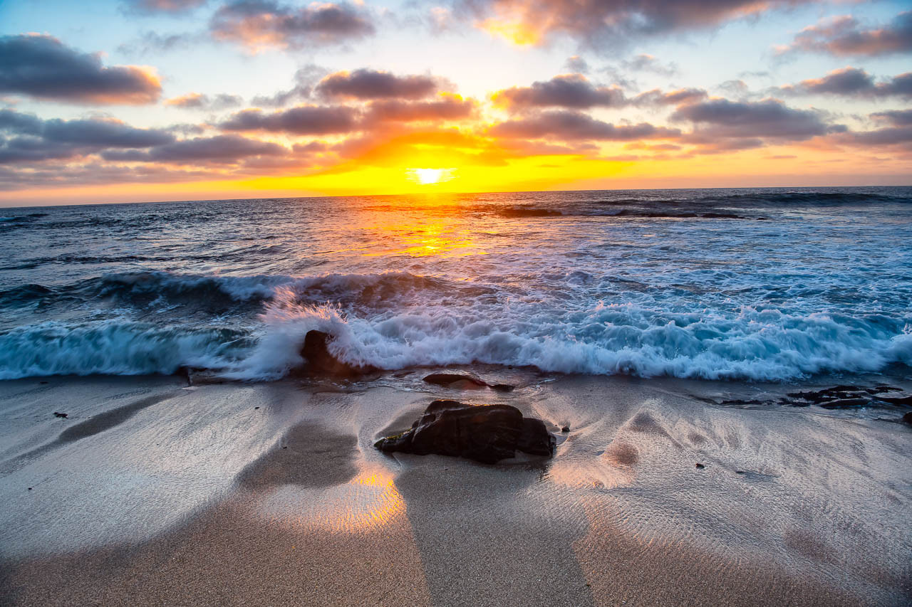 The rocky shore of Windansea Beach is perhaps best known for its beautiful scenery and surf breaks created by underwater reefs. Much of Windansea experiences moderate to severe shore break, a condition on steep beaches which results in hard breaking surf right at the shoreline. This makes it a popular location for surfing; however, swimmers should enter and exit the water carefully to prevent potentially serious injury. Sandstone rocks act as partitions along the beach offering a secluded place for sunbathing.