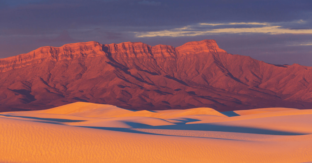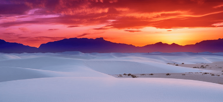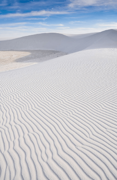 White Sands National Park is situated in the Tularosa Basin, between Alamogordo (northeast) and Las Cruces (southwest) and is a vast, natural playground of dazzling sands that reflect the sun. The wind-blown gypsum sand makes the sand crystals shine “white” to the naked eye. The park is surrounded by the White Sands Missile Range and covers 145,762 acres or 227.8 square miles, including the southern 41% of a 275 square miles field of white sand dunes composed of gypsum crystals. This gypsum dune field is the largest of its kind on Earth, with a depth of about 30 feet or 9.1 meters, dunes as tall as 60 feet or 18 meters, and about 4.5 billion short tons or 4.1 billion metric tons of gypsum sand.