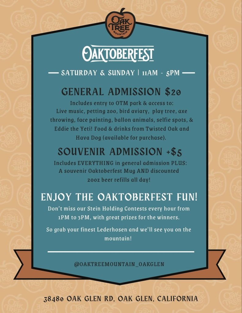 Oak Tree Mountain was established 50 years ago as a small apple shed. This led to selling Apple Pies and Apple Cider and eventually grew to be a 14-acre family fun park in Oak Glen, California. You’re invited to come enjoy food, games, music and dancing.